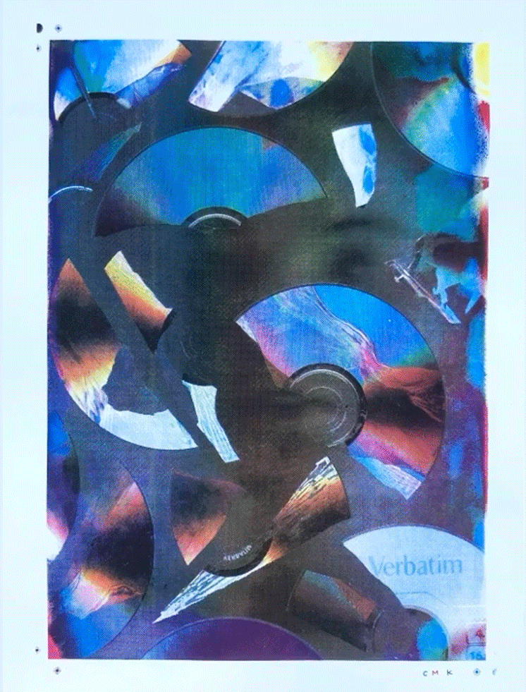 Verbatim is a print series about the nature of memory. I scanned broken DVDs while leaning over the scanner glass to create a murky background portrait. The most exciting part of silkscreening is its unpredictability - any variations in the cyan, magenta, yellow or black layers creates new combinations, and dozens of unique prints.